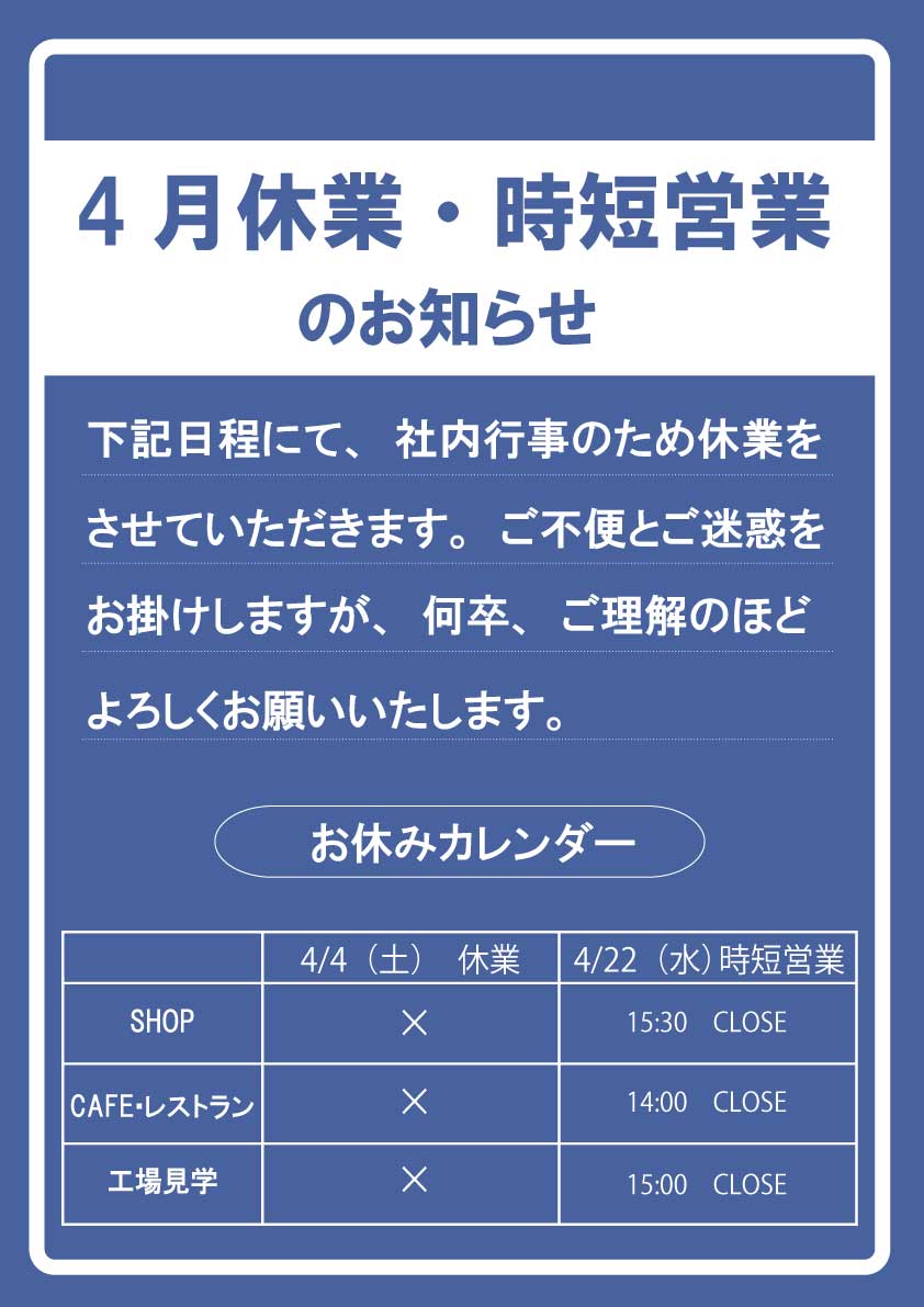 - 2026.3.24 - 4/4休業、4/22時短営業のお知らせ