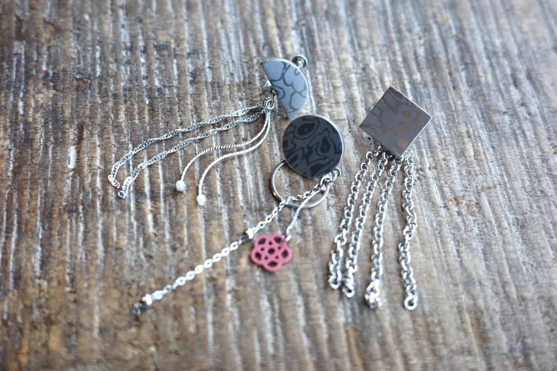 本体験では、ブラスト加工によってダマスカス特有の模様を引き出した後、さまざまなパーツを組み合わせ、つなげたり重ねたりしながら、世界にひとつだけのオリジナルピアスまたはイヤリングを制作いただけます。