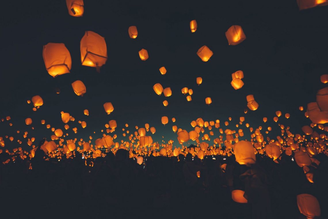 本イベントで使用するスカイランタンは環境保全の観点から、火を使わずヘリウムガス風船とLEDランプを使用したランタンを使用し、紐付きで飛ばした後、回収・お持ち帰りいただきます。