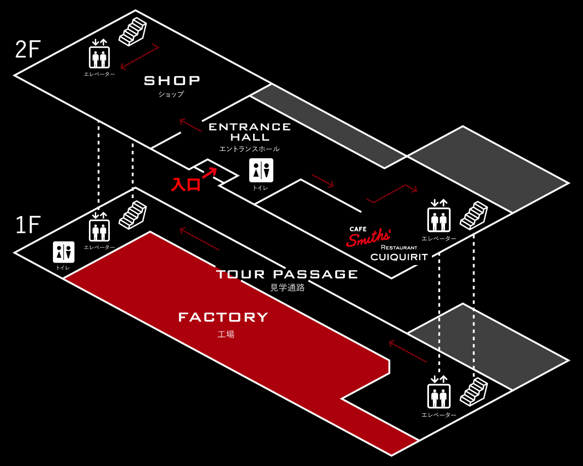 Restrooms トイレなどの設備は弊社社員も使用し、見学通路の一部は台車などが通ることがあります。