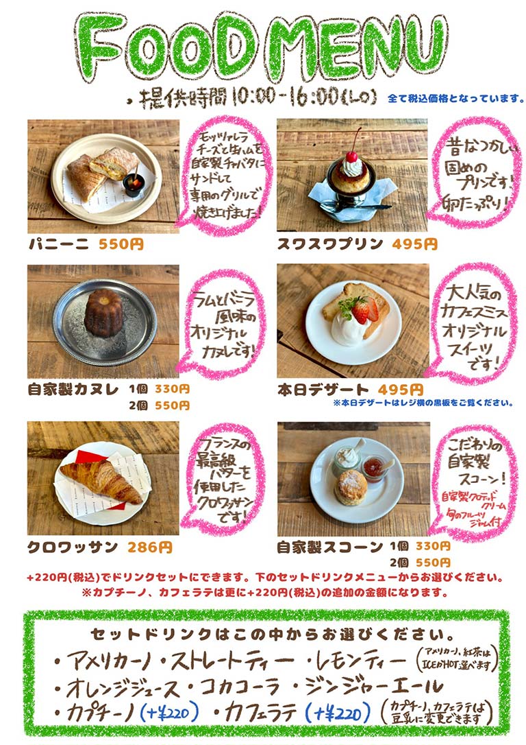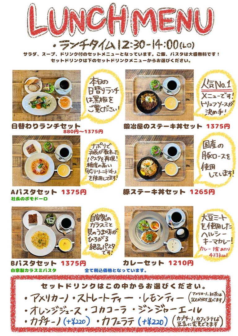 | 営業時間 | SUWADAショクドウ RESTAURANT CUIQUIRIT 12:30〜14:00(ラストオーダー) (※限定数に達し次第終了) 火曜日ー日曜日・祝日(日曜・祝日のみ11:30~14:00) ※ 毎週月曜日、年末年始、4/1休業 ※ 座席:50席 団体様向けランチ付き工場見学プランについてはこちら CAFE Smiths’ 10:00〜17:00(軽食の提供時間は10:00~16:00) ※年末年始、4/1休業 ※ 座席:50席 |